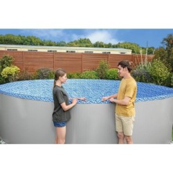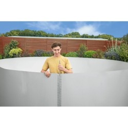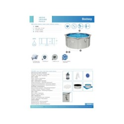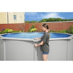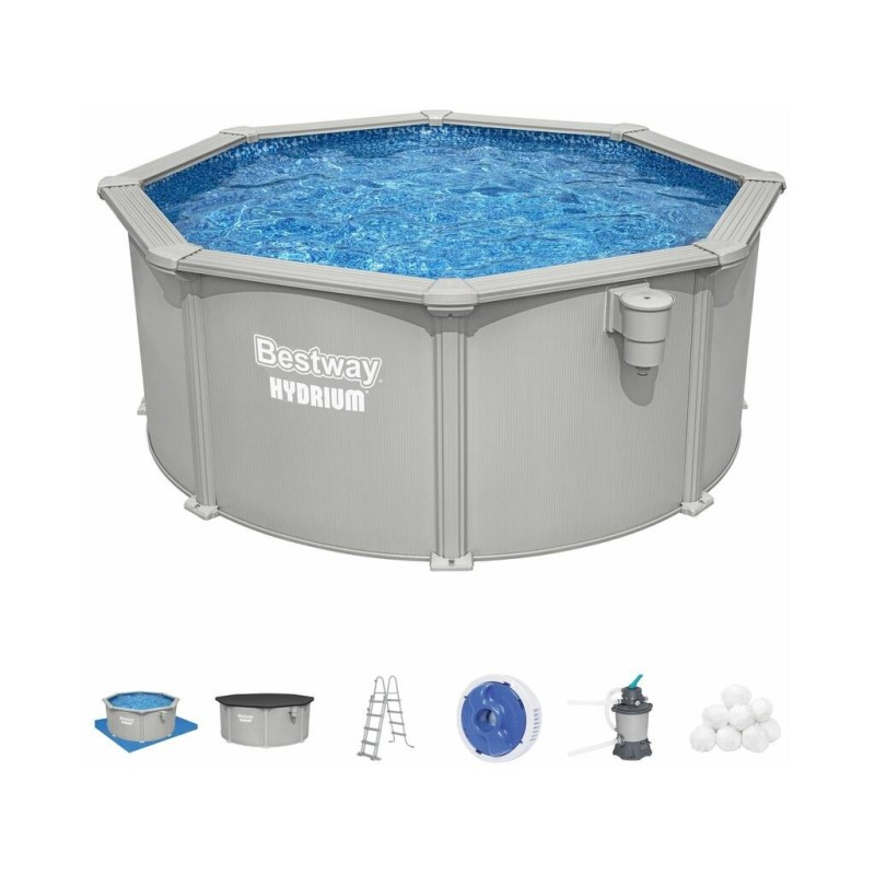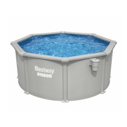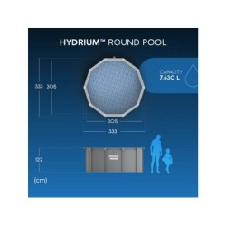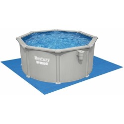 PISCYNA BESTWAY HYDRIUM 56566 305 x 122 cm Fantastyczna na taras lub do ogrodu. Wysoka wytrzymałość. Specyfikacja: - Pojemność: 7.630 litrów (ok. 90%) - Wymiary: 305 x 122 cm (średnica x wysokość) - Wymagana przestrzeń z podporami: 350 x 350 cm - Czas montażu: ok. 2 godziny (2-3 osoby) - Górna krawędź wokół basenu o szerokości 16 cm - Może pozostać zmontowana przez cały rok W zestawie: - Liner odporny na promieniowanie UV - Filtr piaskowy 3.596 L/h - Kule filtracyjne Polysphere do filtra - Drabinka bezpieczeństwa z 4 stopniami - Dozownik Chemconnect - Mata pod basen - Pokrywa - Skimmer