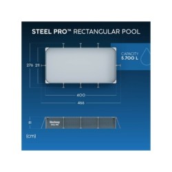 BASEN ODPINANY BESTWAY 56424 400 x 211 x 81 cm Fantastyczny na taras lub ogród. Wielki opór. Funkcje: - Pojemność 5700 litrów (około) - Rozmiar 400 x 211 x 81 cm (długość x szerokość x wysokość) Za pomocą: - Pompa z filtrem do 1249 litrów / godzinę Ref 58381 (wykorzystuje filtry kasetowe Ref 58093, w zestawie) - Liner 3-warstwowy arkusz poliestru i PVC, odporny na ciśnienie wody i chemikalia, poddany działaniu promieni UV
